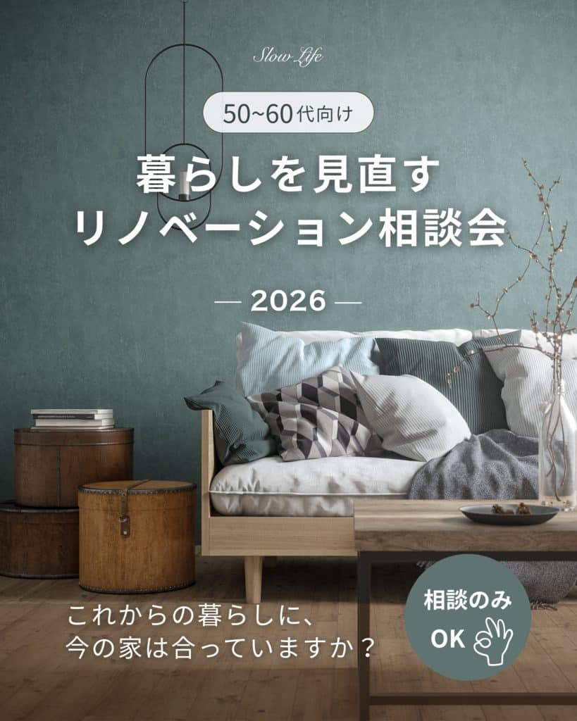 寒さや暑さ、耐震性、間取りの使いづらさなど、長く住んできたからこそ感じるお悩みはありませんか。50〜60代を迎え、これからの暮らしを見据えて、「今の家をもっと安心で快適にしたい」とお考えの方へ向けたリノベーション相談会です。